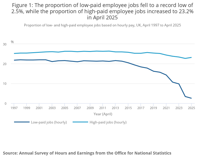 Tall fra Office for National Statistics (okt. 2025) viser nemlig at andelen lavtlønnede jobber er på sitt laveste siden undersøkelsen startet i 1997, og har falt fra 21,8 prosent til 2,5 prosent fra 1997 til 2025.